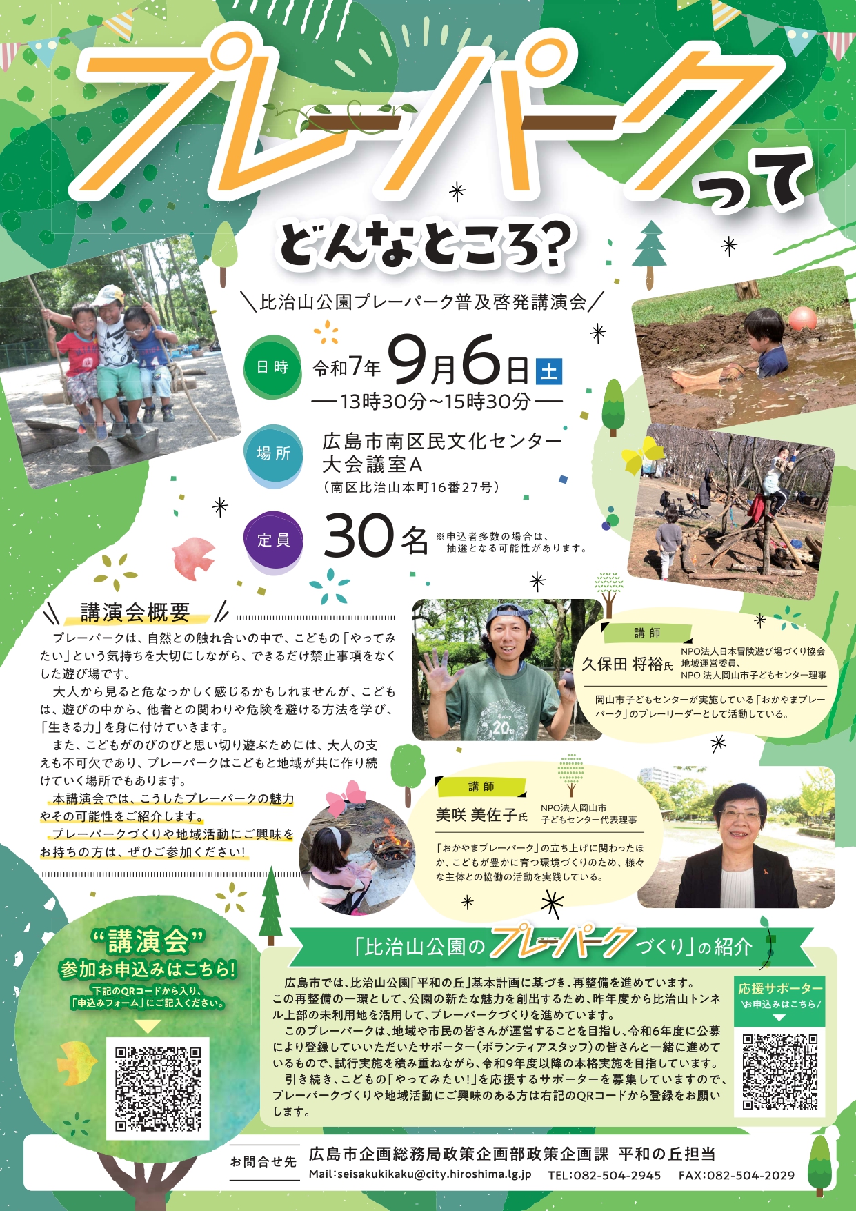 【広島市】比治山公園プレーパーク普及啓発講演会「プレーパークってどんなところ?」が開催されます2025年9月6日(土)13時半~15時半、当会が開催サポート、講師派遣をしている講演会が広島市で開催されます。