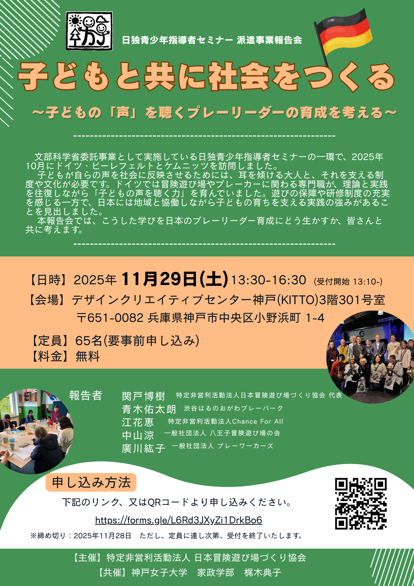 本報告会では、こうした学びを日本のプレーリーダー育成にどう生かすか、皆さんと共に考えます。