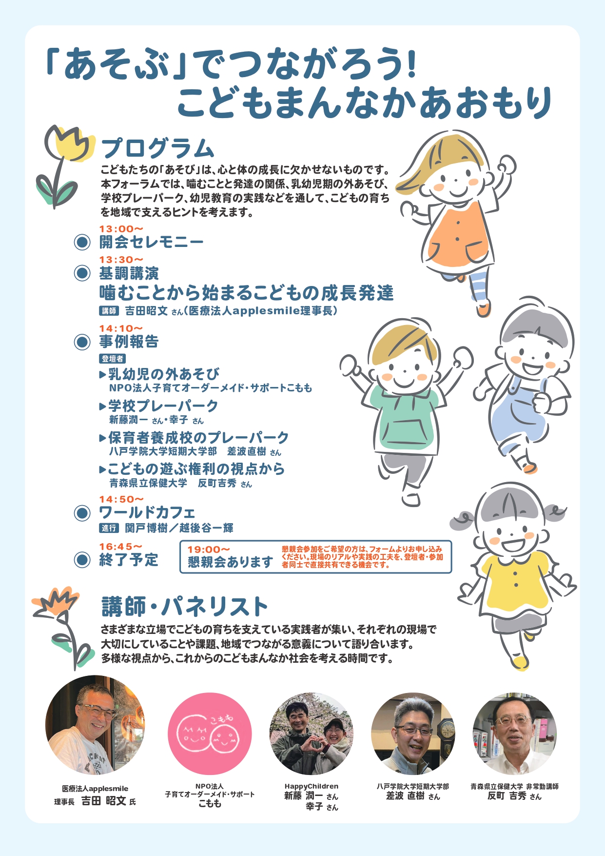 本フォーラムでは、「『あそぶ』でつながろう!こどもまんなかあおもり」をテーマに、こどもたちの遊びや成長を地域で支える取り組みについて、多様な視点から考えます。